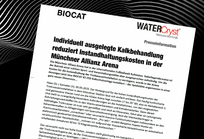 Die Münchner Allianz Arena hat in der internationalen Fußballwelt Kultstatus. Naheliegenderweise ist der Betrieb einer solchen Sport- und Veranstaltungsstätte aber ausgesprochen aufwändig. Um die Kosten für die Instandhaltung der Trinkwasserinstallation zu verringern, wurde in der Arena deswegen jetzt eine BIOCAT KS 25D Kalkschutzanlage installiert – der Spielstätte angemessen in einer ganz neuen Dimension…
